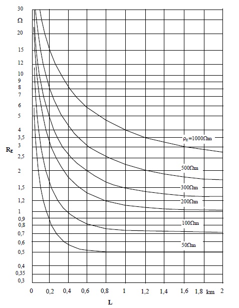 Şekil-K.3 Kablo boyuna ve toprak özdirencine bağlı olarak topraklayıcı etkisi olan kablonun yayılma direncinin tipik değerleri